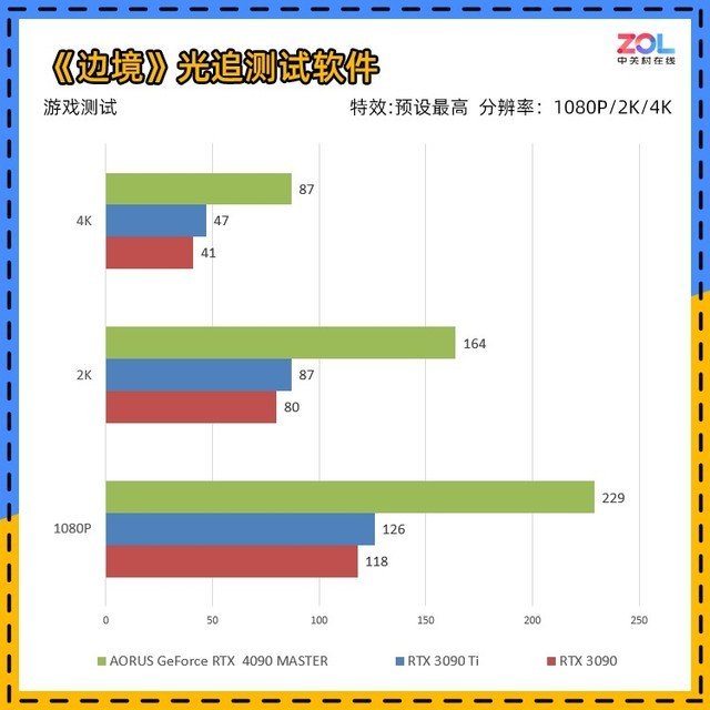 在《边境》中,AORUS GeForce RTX 4090 MASTER 相比GeForce RTX 3090 Ti 的提升分别为:1080p提升82%;2K提升89%;4K提升85%,综合提升85%。