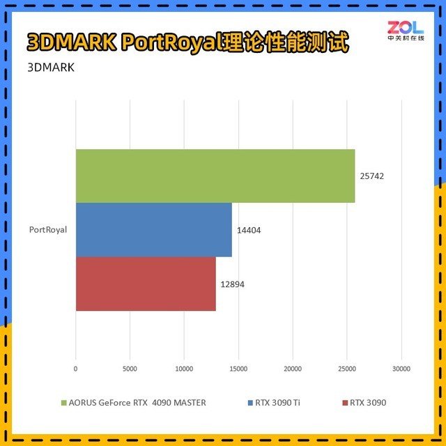 PortRoyal是3DMARK中专门针对光追性能的测试项,AORUS GeForce RTX 4090 MASTER 相较GeForce RTX 3090 Ti 的提升约为79%。综合来看,AORUS GeForce RTX 4090 MASTER 的理论性能相较GeForce RTX 3090 Ti的提升约为74%。