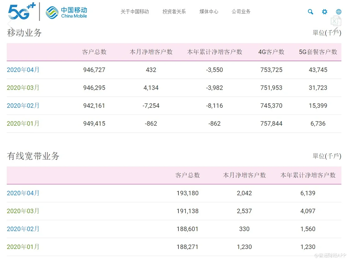 智通财经APP获悉,5月20日,中国移动(00941)公布2020年4月份运营数据。数据显示,2020年4月份,中国移动用户总数达到9.46727亿户,当月净增客户数43.2万户。