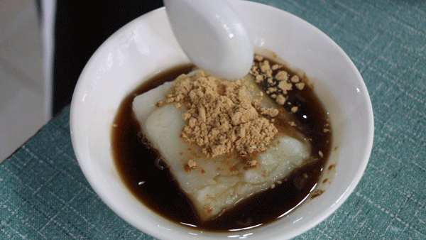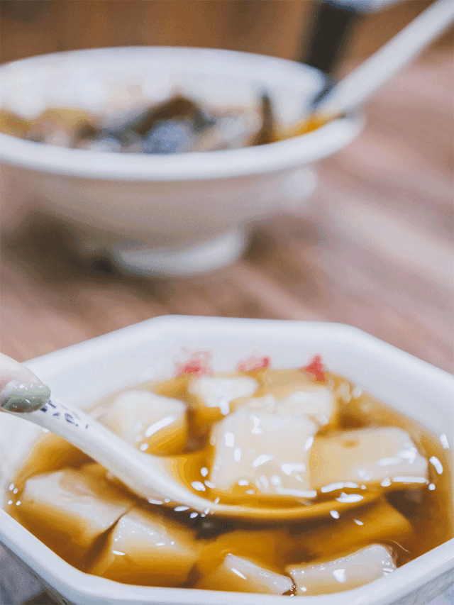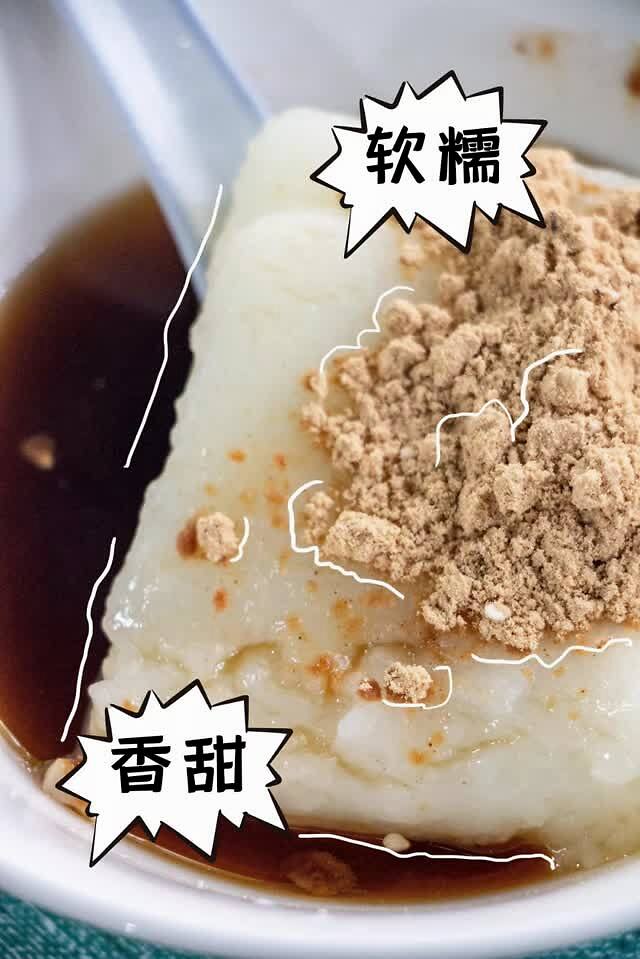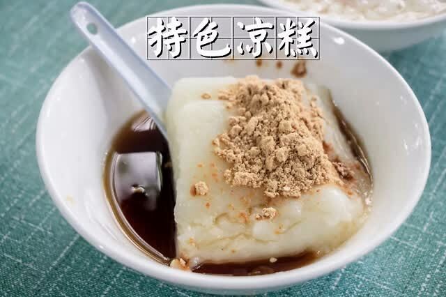 去年发现的宝藏小吃店,进店必点 特色凉糕 。看起来软软嫩嫩的小方块,上面有一勺黄豆面,下面是min甜的红糖水,还有碎花生和白芝麻。