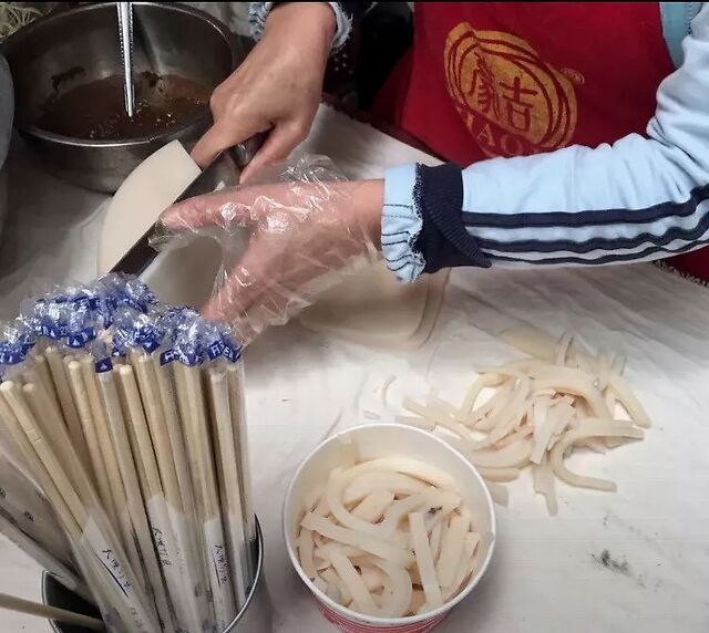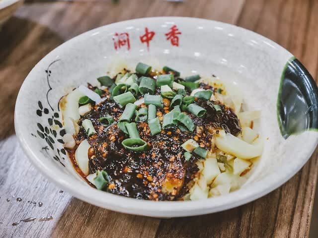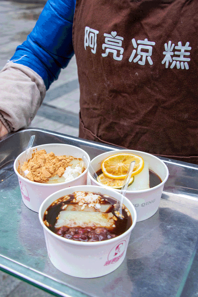 口感Q弹、软糯 ,每碗凉糕都会淋上红糖水和黄豆面,再加上一勺醪糟,味道清香,还能解辣,和旁边的烧烤绝配。
