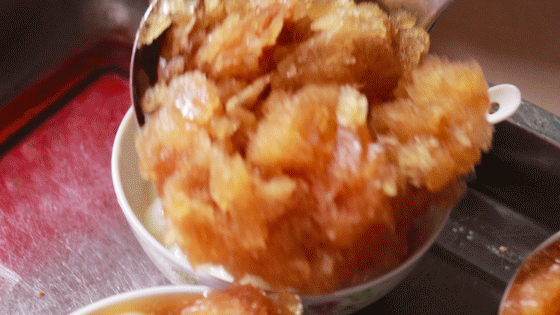 刨冰配有泰王茶和珍珠。先将茶淋到奶盖上,再加入珍珠。这样的搭配堪称完美。先舀起一勺外边的碎冰,第一口味道比较淡,但是冰打得很细,吃不到较大的冰渣子,口感是比较细腻的。