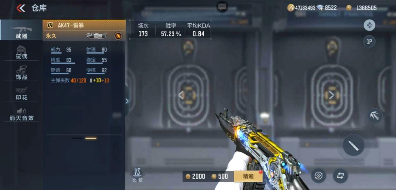 在基础属性方面,雷暴和我们老大哥火麒麟是一样的,相比火麒麟16个钥匙+几万钻石的获得难度,雷暴在一定程度上还是有不错的性价比的。其他属性方面,雷暴的射速达到了571发/分,同时换弹速度也达到了不错的水准,打空子弹后能有不错的补充,射速则是没有超过以扫射著称的无影,合情合理。简单来说,AK47-雷暴就是火麒麟的孪生兄弟,类似的手感、一样的弹道、强力的伤害无距离衰减,在竞技属性中可以说是一比一的复刻,优秀的弹道仅次于王者之心和孟德,炫酷的外观和特效让人拿到后爱不释手!
