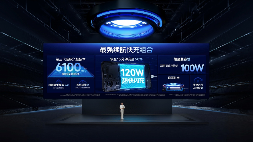 iQOO Neo10系列搭载蓝海续航系统,以“更强三代硅、更强兼容、更薄机身”,挑战行业最强续航快充组合,打造“不可能的黄金续航三角”。Neo10系列拥有第三代硅碳负极材料的等效6100mAh蓝海电池,仅需15分钟即可从1%充至50%。Neo10系列支持机身和充电套装“双百瓦”充电协议,快充兼容性在业内表现更为突出,还支持低温直驱供电。