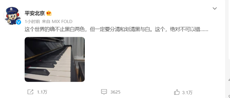 @平安北京 发布微博称,这个世界的确不止黑白两色,但一定要分清和划清黑与白。这个,绝对不可以错……