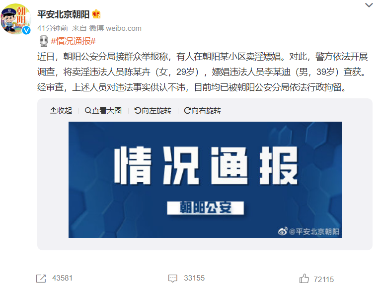 据北京市公安局朝阳分局官方微博通报,近日,朝阳公安分局接群众举报称,有人在朝阳某小区卖淫嫖娼。对此,警方依法开展调查,将卖淫违法人员陈某卉(女,29岁),嫖娼违法人员李某迪(男,39岁)查获。经审查,上述人员对违法事实供认不讳,目前均已被朝阳公安分局依法行政拘留。
