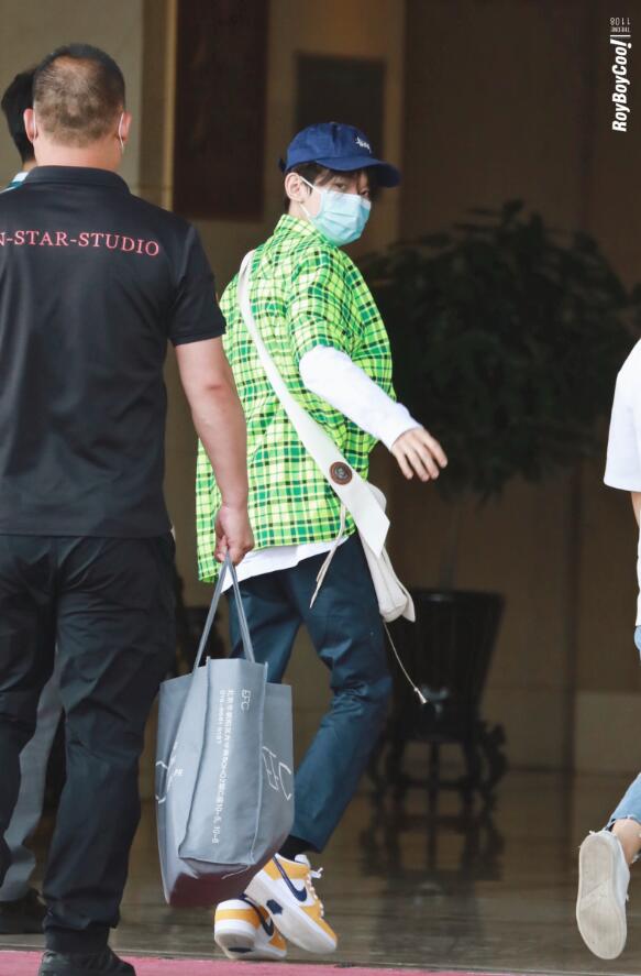 王源身穿修身长裤搭配阳光率性的绿色格纹衬衫,