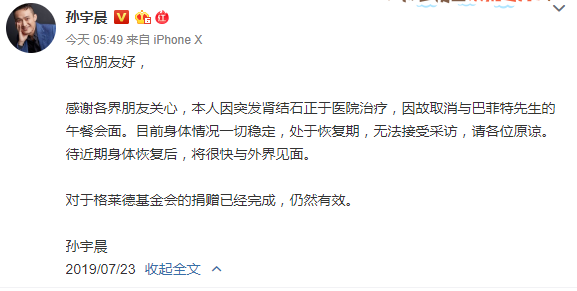 7月23日,因突发肾结石在医院治疗,孙宇晨在其个人微博表示,取消与巴菲特午餐会面。此前孙宇晨以创纪录的456.7888万美元,成功拍下巴菲特20周年慈善午餐。据21世纪经济报道 ,孙宇晨仍在境内。在其取消赴约之际,有几项问题待解答:其“陪我”App涉嫌色情交易;波场项目以赌博类应用为主,且境内用户可以直接访问。