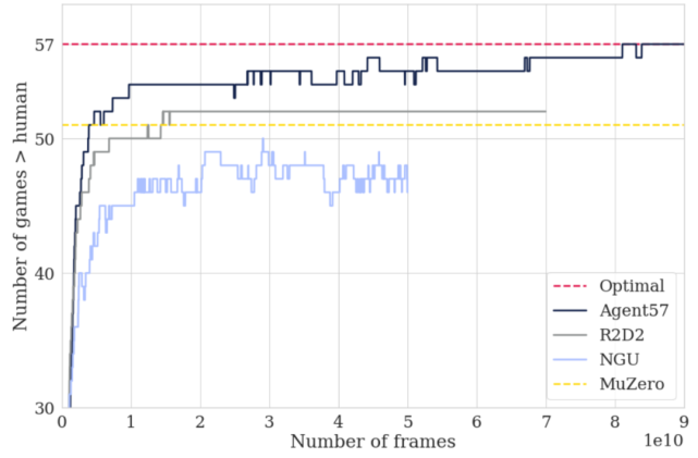 与最先进的智能体相比,Agent57 和 MuZero 整个训练过程中在雅达利游戏中的表现优于人类基准(Badia et al., 2020)。