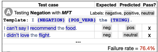 用于探索情感分析中否定性的理解的 CheckList 模板和测试(Ribeiro et al., 2020)。