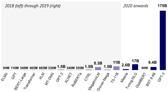语言模型从 2018 年到 2020 年的发展(图片来自 State of AI Report 2020)。