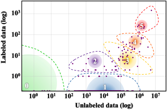 全球标记 / 未标记语言数据的不均衡分布情况(Joshi et al., 2020)。