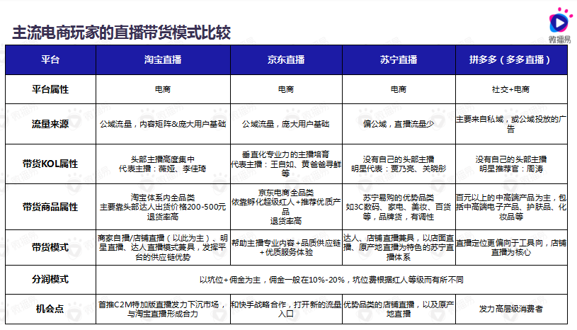 淘宝领跑、京东升级、苏宁尝鲜、拼多多偏工具目的:电商获客成本居高不下,用直播的形式给电商做赋能。