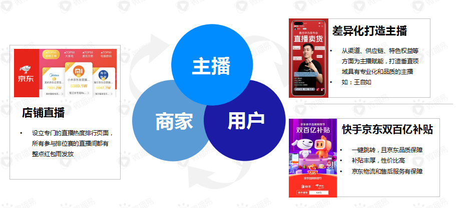 最大化发挥供应链优势,打造三方共赢的直播生态,通过对商家、主播、用户三方的补贴与赋能,帮助直播快速建立生态规模。