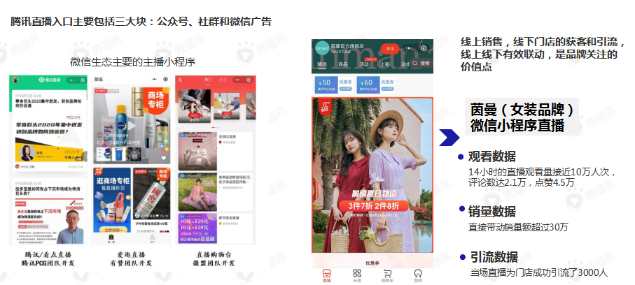 目前,腾讯直播作为工具,出现在商家本身的微信生态中,入口主要包括三大块:公众号、社群和微信广告。