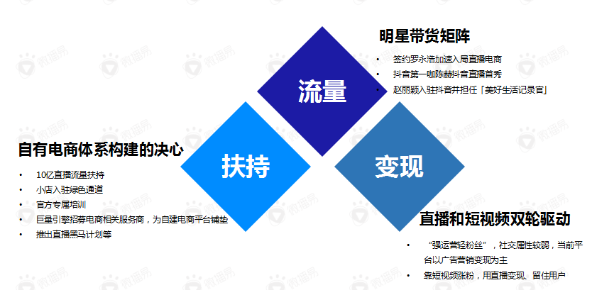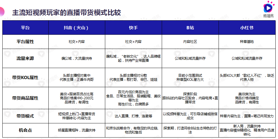 抖音流量广、快手有江湖、小红书走B2K2C模式、B站内部试水中目的:通过直播来做电商加码。
