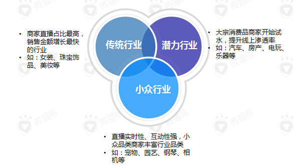 淘宝平台不同行业商家参与直播热潮中来,对传统行业更为友好,大众高消费品类及各小众(宠物、园艺等)行业通过曝光率、特色直播,正在提升各自竞争力。