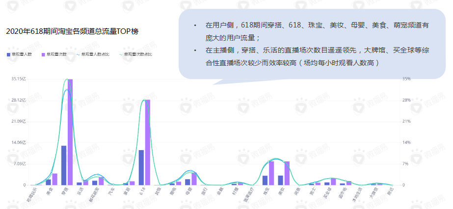 在优势的基础上,促发了淘宝直播卖货后,强体验、高复购、低退货率的消耗品在平台大放异彩的局面。以618数据为例,穿搭频道热度最高,转化也十分可喜。
