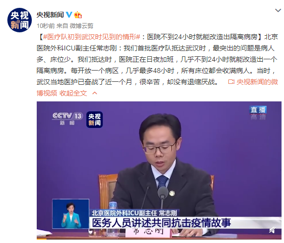 【#医疗队初到武汉时见到的情形#:医院不到24小时就能改造出隔离病房】北京医院外科ICU副主任常志刚:我们首批医疗队抵达武汉时,最突出的问题是病人多、床位少。我们抵达时,医院正在日夜加班,几乎不到24小时就能改造出一个隔离病房。每开放一个病区,几乎最多48小时,所有床位都会收满病人。当时,武汉当地医护已奋战了近一个月,很辛苦,却没有退缩厌战。