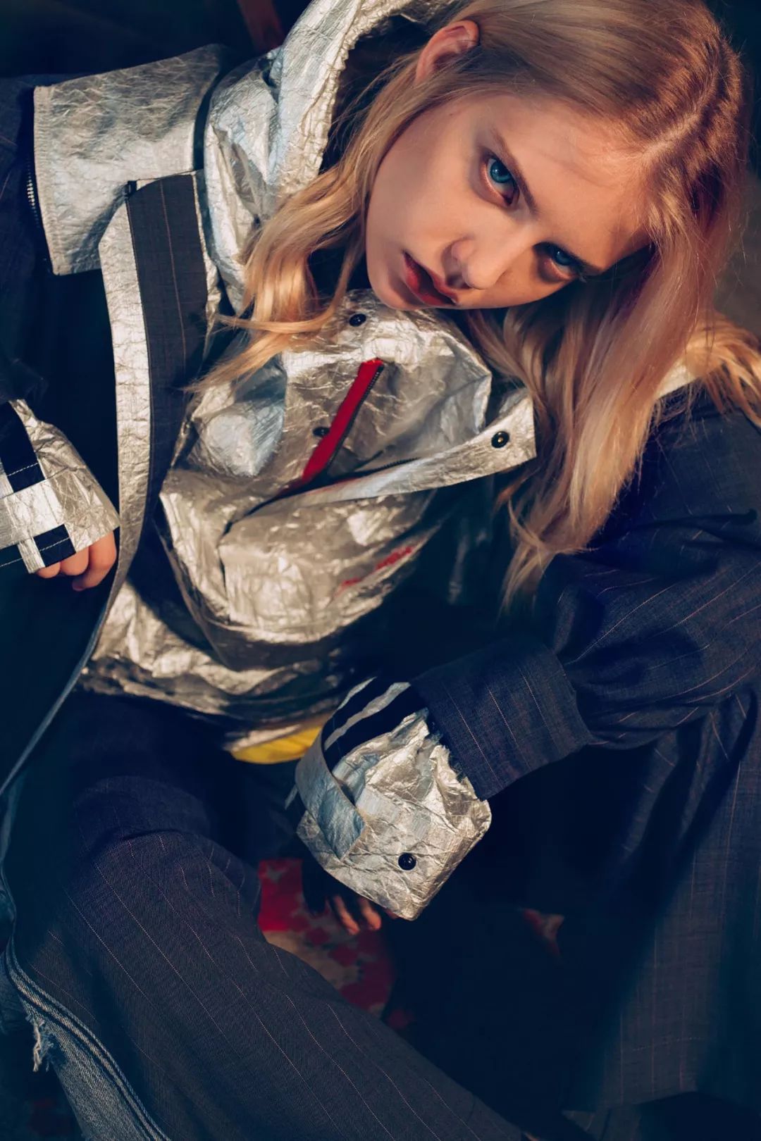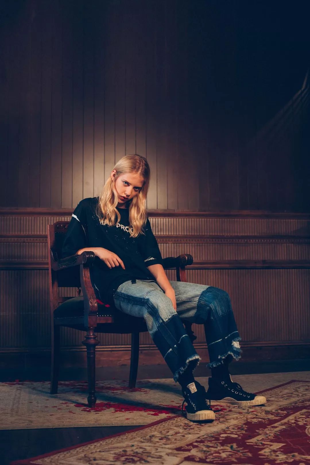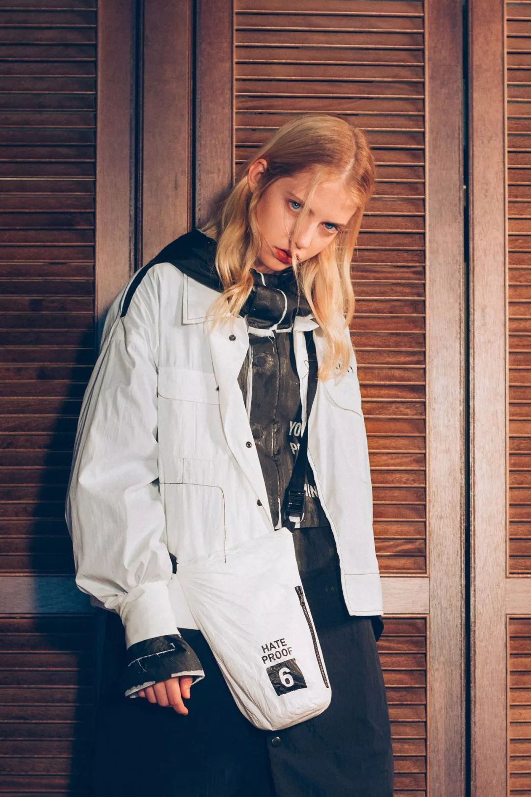 本季 INDICE STUDIO 更大胆的将属于精英阶层的西装布料与劳工阶层的丹宁布料做结合,营造出冲突的视感。在印花上,使用做工覆杂的手工成衣印法,白底露出「HATE PROOF」的字样,直白的对酸民的言语暴力比出中指。基于设计师对工艺的实验精神,本次于材质上加入了杜邦工业用纸,放大 INDICE STUDIO 对于媒合异材质与街头轮廓的用心。最后,INDICE STUDIO 试图将台湾的庙宇文化参入本季的设计元素中。品牌实验性的将台湾寺庙的护身符做成金项链与吊饰,冲突的将亚洲文化与西方轮廓的服饰做结合,撞出独特又新颖的火花。
