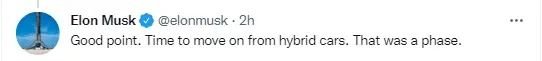 马斯克认为,混动汽车只是汽车发展的一个短暂阶段,现在是时候放弃了。