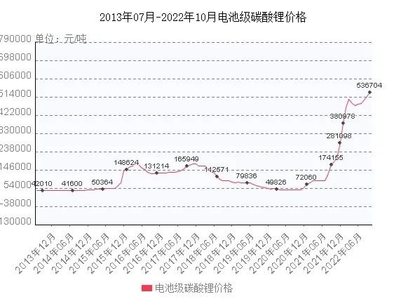 动力电池原材料镍、锰、钴、锂等价格自去年就轮番飙升。截止到2022年的10月中旬,锂电正极原材料碳酸锂的价格已经突破53万元/吨。