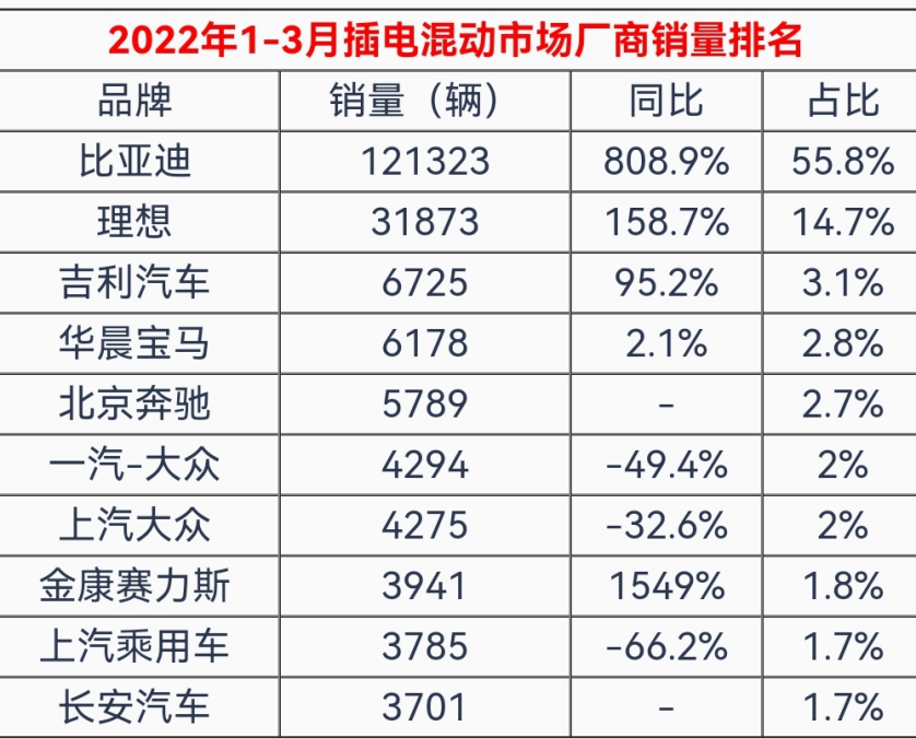 2022第一季度,插电混动汽车的国内市场格局,如下表所示(数据来源:车主指南):