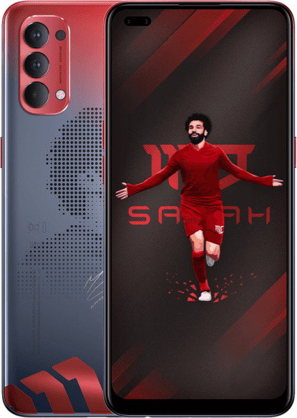 这款萨拉赫定制版的 OPPO Reno4 的采用了深灰色和红色的配色元素,背后印有萨拉赫的头像剪影以及亲笔签名。