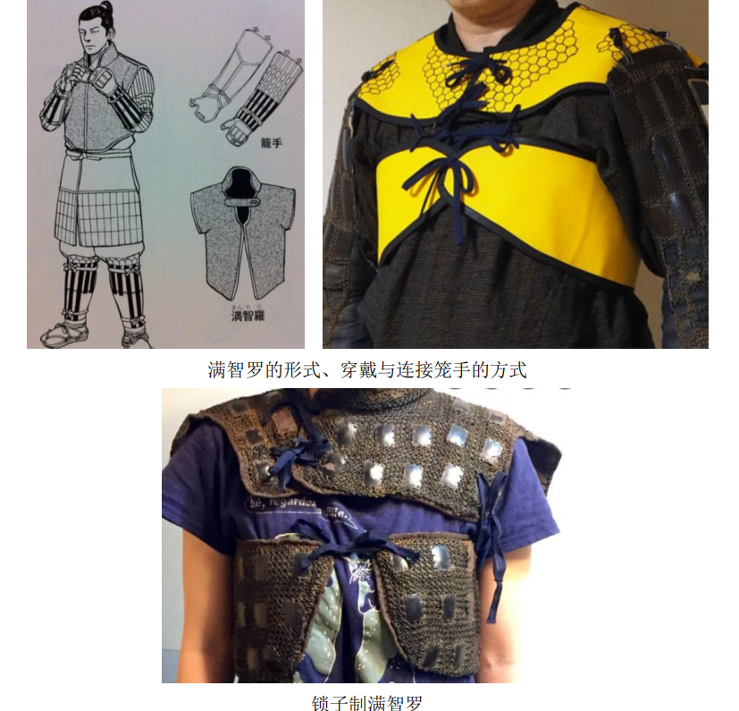满智罗则是另一种代表,是武士穿戴在盔甲下方、内衣上方的一种披肩或短外套形式的护甲,用于缓冲和分散盔甲的重量,同时承担着将长笼手连接起来的作用,防御效果其实相当勉强。在室町幕府中期,这种护具主要有织物和鹿皮制成,在锁环被广泛应用之后,新的锁甲迅速替代了以往的布料和皮革,迅速成为了满智罗的主流材质。在战国末期,几乎所有武将和大名都使用轻便坚固的锁子满智罗。