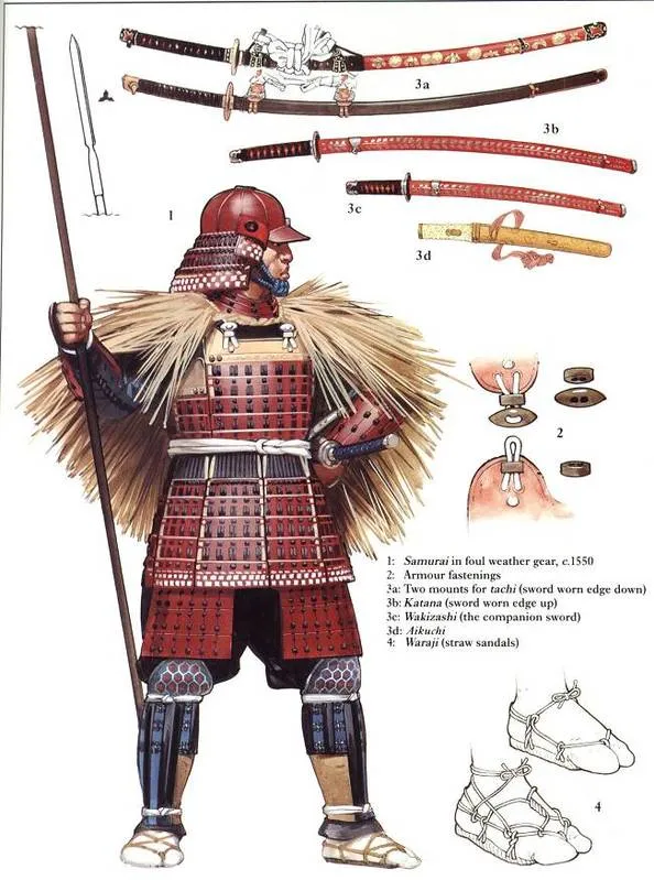 就像是中世纪的欧洲骑士会采用罩袍,来防止对手观察和攻击自己的上肢弱点一样,日本的武士们也会在战场上披上蓑衣或者袍子来掩饰和自己上身的防御弱点,但那终究不是一种掩饰罢了。这些防具对于劈砍尚有一定的效果,但在面对戳刺时则几乎毫无作用。