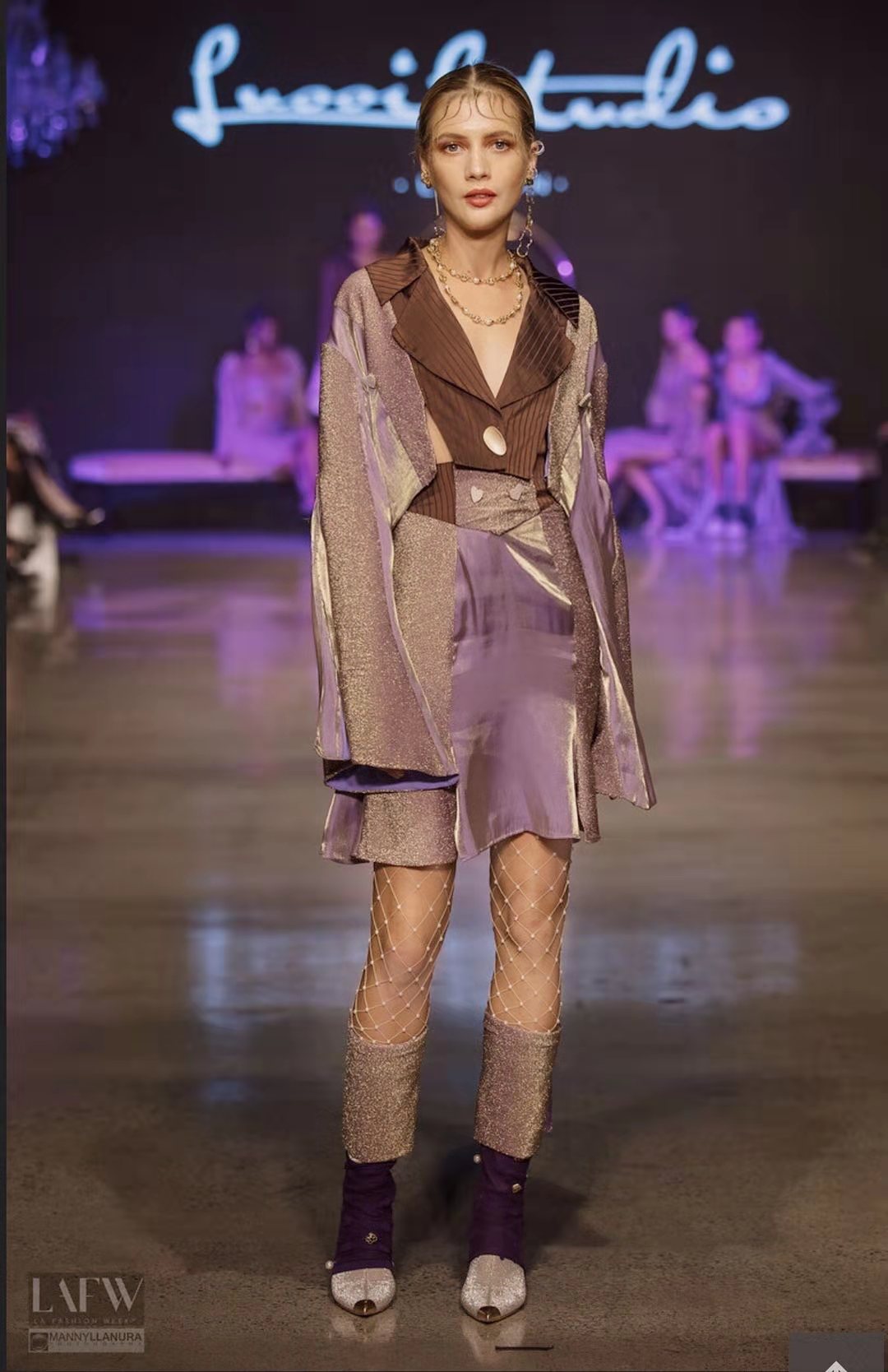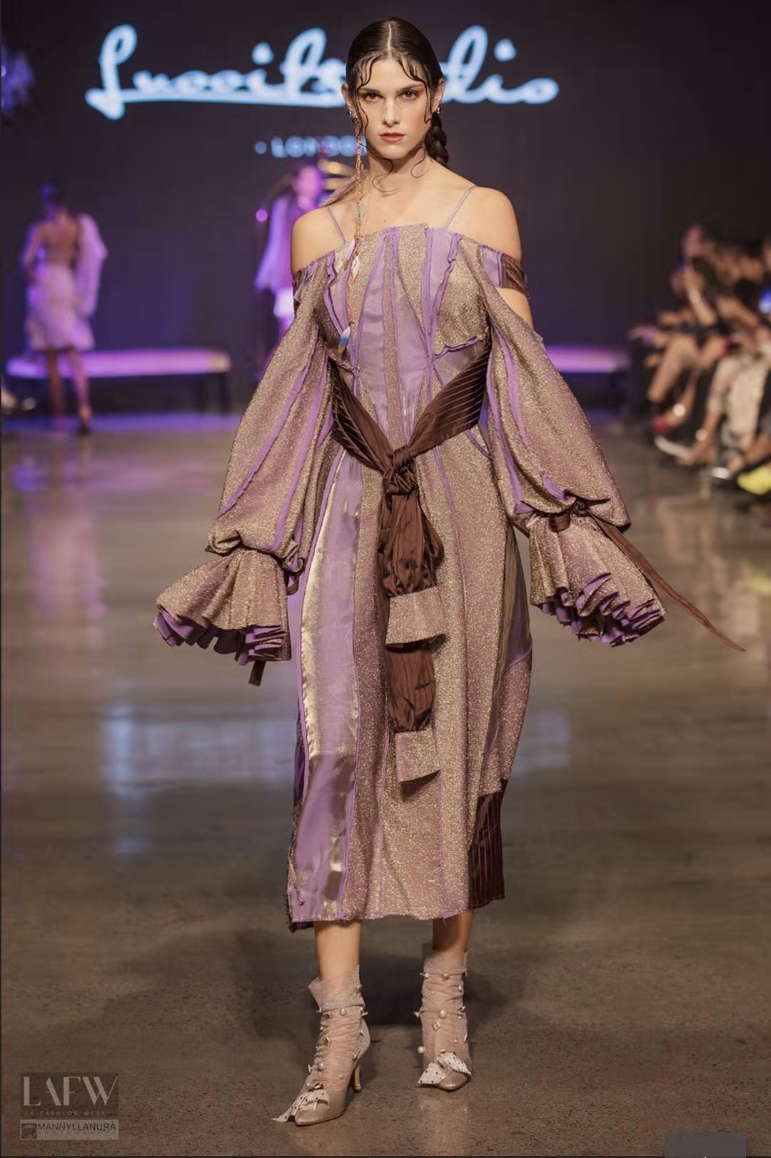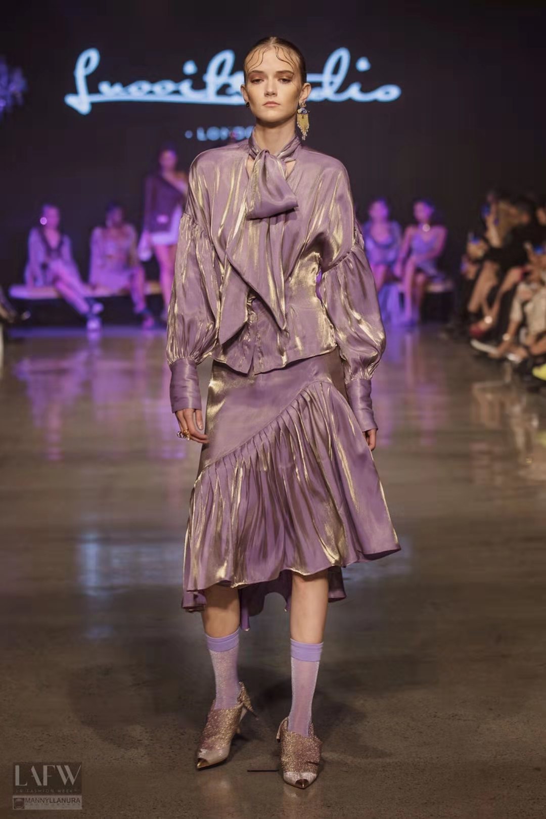 “万紫千金”和“贵气逼人”是这个季度的主打。大量的螺旋形荷叶边叠层和LUOOIFSTUDIO一直以来坚持的小翘臀,小蛮腰的S型弧版设计再加上这季度特有的休闲和偏运动元素,从中表达出的潇洒,高贵,挣扎,抗争,糅合等元素恰好和主题的“second face”相呼应,在这个主题内我们更多用服装载体表达的是其挣扎性,不和谐性以及最后一切都包容的特点和性质。S/S 2020对于很多人来说都是奋斗和挣扎的一年,从人性的:双层面具“second face”就可以发现,很多虚伪的面具都被社会徒手撕裂,很多隐藏不住的野心都被放大到了光影下,林林种种的挣扎和奋力向上的缘由都会被舞台记录成为LUOOIFSTUDIO S/S 2020的养分。本个季度的色彩非常浓烈,从金紫色到布鲁士蓝再从布鲁士蓝到香槟白,颜色强烈的对比以及颜色强烈的碰撞让观众欲罢不能。