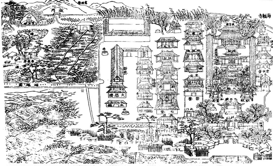 《1796年西班牙人阿格特订制海幢寺外销画册》里描绘的海幢寺,比现在占地面积大很多,殿堂也比现在多。目前,海幢寺的殿堂,只有大雄宝殿、部分塔殿是在原来的基础上重修的,其他基本上都是现代复建的。