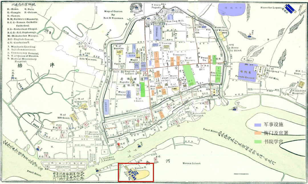 清代咸丰年间广东省城图(加标注,图中红框处为海幢寺),图片来源自:何韶颖;清代广州佛教寺院与城市生活[D];华南理工大学;2012年