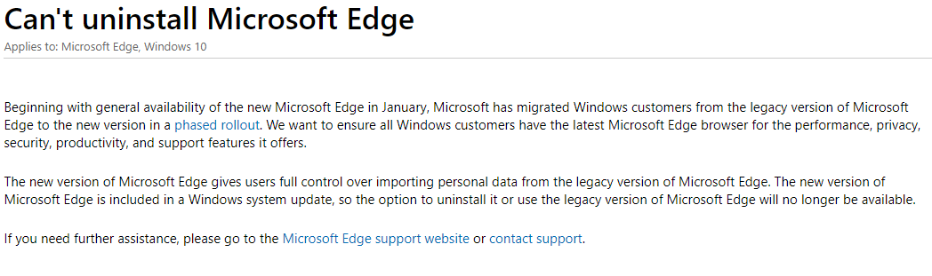 不过有意思的是,不同于用户可以卸除IE,用户在升级到了Windows 10 2020后,其内置的新版Edge浏览器是卸除不了的。微软大概也是知道有很多人想卸除Edge但不成功,所以特意在支持页面内加了一版“不能卸除微软Edge”的说明(笑)。