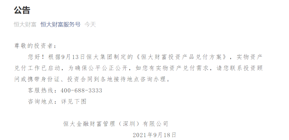 9月18日,恒大财富服务号发布公告称,根据9月13日恒大集团制定的《恒大财富投资产品兑付方案》,实物资产兑付工作已启动。如有实物资产兑付需求,需联系投资顾问或携带身份证、投资合同到各地接待地点咨询办理。