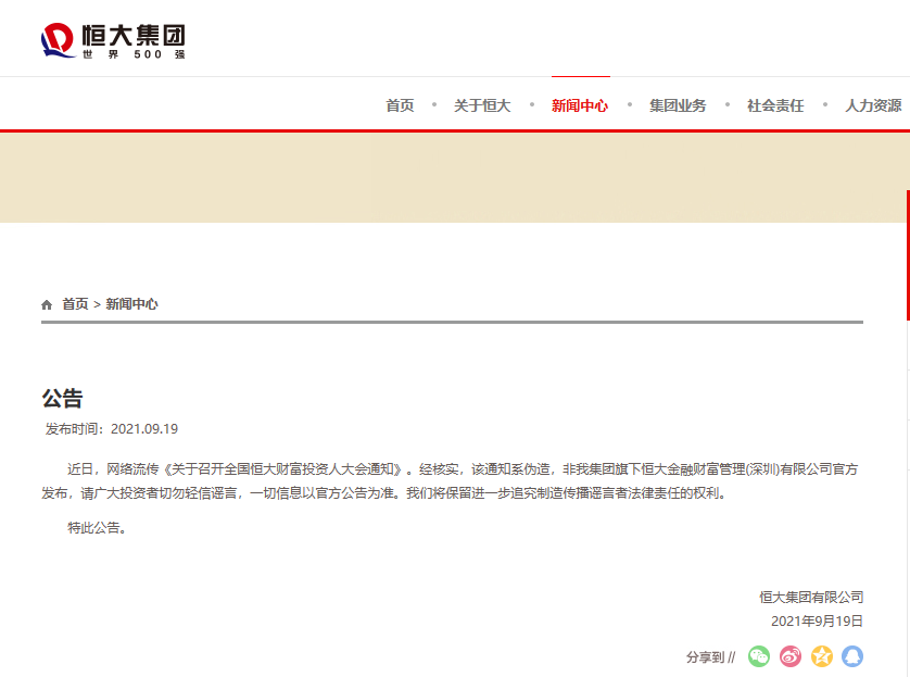 9月19日晚间,恒大集团发布公告称,近日,网络流传《关于召开全国恒大财富投资人大会通知》。经核实,该通知系伪造,非我集团旗下恒大金融财富管理(深圳)有限公司官方发布,请广大投资者切勿轻信谣言,一切信息以官方公告为准。公司将保留进一步追究制造传播谣言者法律责任的权利。
