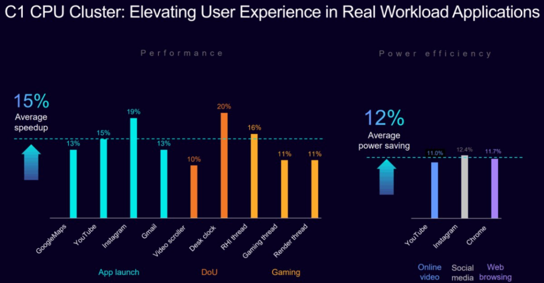 Arm C1 CPU 集群在实际用例中表现突出。在行业领先的性能基准测试,该 CPU 集群在同等条件下,相较于上一代 CPU 集群性能平均提升 30%,在游戏和视频流媒体等应用中平均提速 15%。与此同时,在日常移动端工作负载(如视频播放、社交媒体、网页浏览)中,该 CPU 集群在同等条件下,相较于上一代 CPU 集群功耗平均降低 12%。