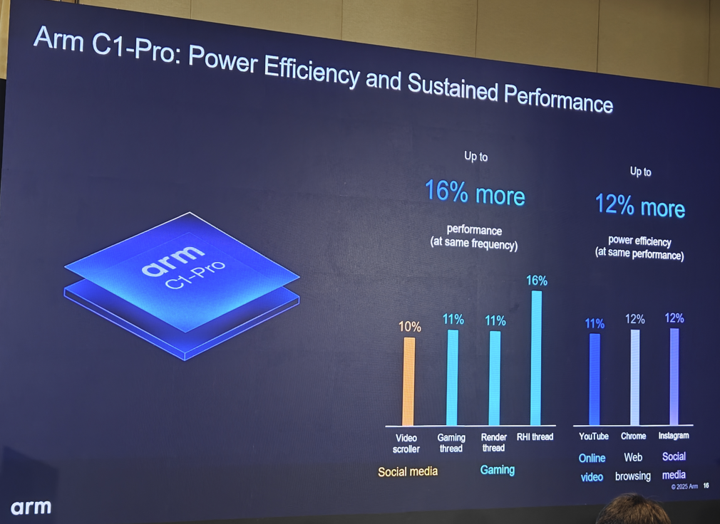 在相关应用测试中,与Cortex-A725相比,C1-Pro CPU在相同主频下,性能最高提升了16%;在相同性能下,功耗降低了12%。