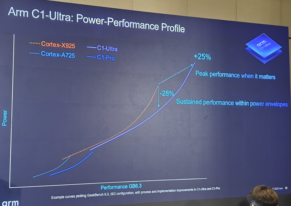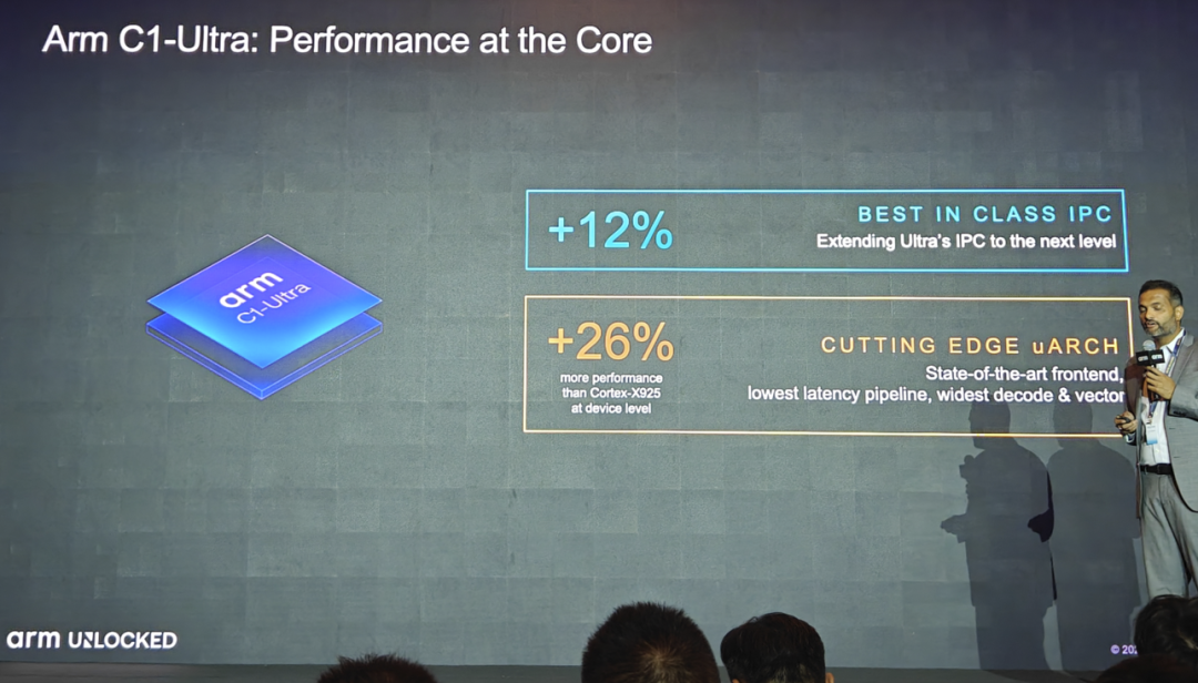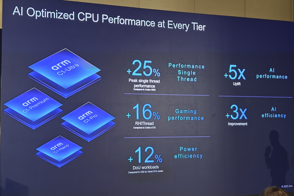 最高性能的 Arm C1 CPU 集群集成了新的 C1-Ultra CPU,以及可灵活组合的C1-Premium、C1-Pro 与 C1-Nano CPU 核心,能够根据合作伙伴的特定需求,实现性能和能效提升。同时,C1 CPU 通过 Armv9 架构直接内建第二代 Arm 可伸缩矩阵扩展 (SME2),这为加速 AI 体验带来了革新突破。