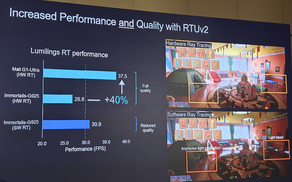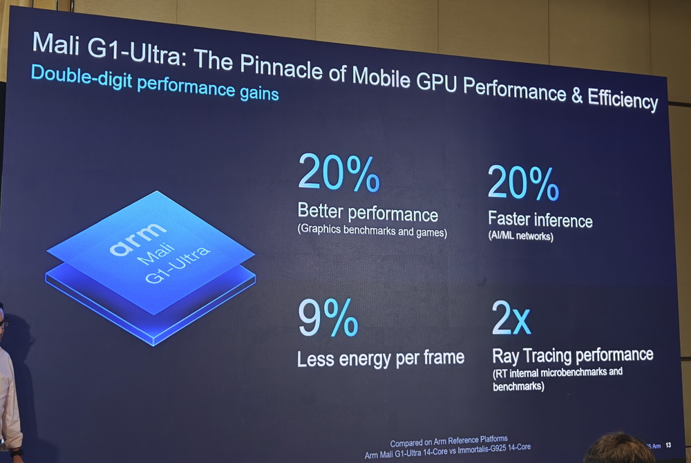 全新的Mali G1-Ultra 则重新定义了移动 GPU 的性能,在光线追踪性能提升的同时,在架构效率和AI加速性能上也迎来了突破性进展,有望为新一代移动终端的游戏体验和AI应用带来更出色的体验。