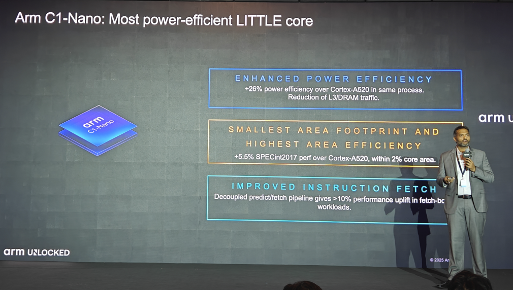 C1-Nano 在最小面积占用的条件下,将 Arm C1 系列 CPU 的优势集于一体。相比此前的Cortex-A520小核,C1-Nano电源效率大幅提高,在同一工艺下,与 Cortex-A520 相比,电源效率提高 26%了;减少 L3/DRAM 交互,实现了最小面积和最高区域效率。与 Cortex-A520 相比,SPECint2017 性能提高 5.5%,核心面积提高 2%;改进了指令获取,解耦预测/获取流水线在获取工作负载方面提高了10%以上的性能。