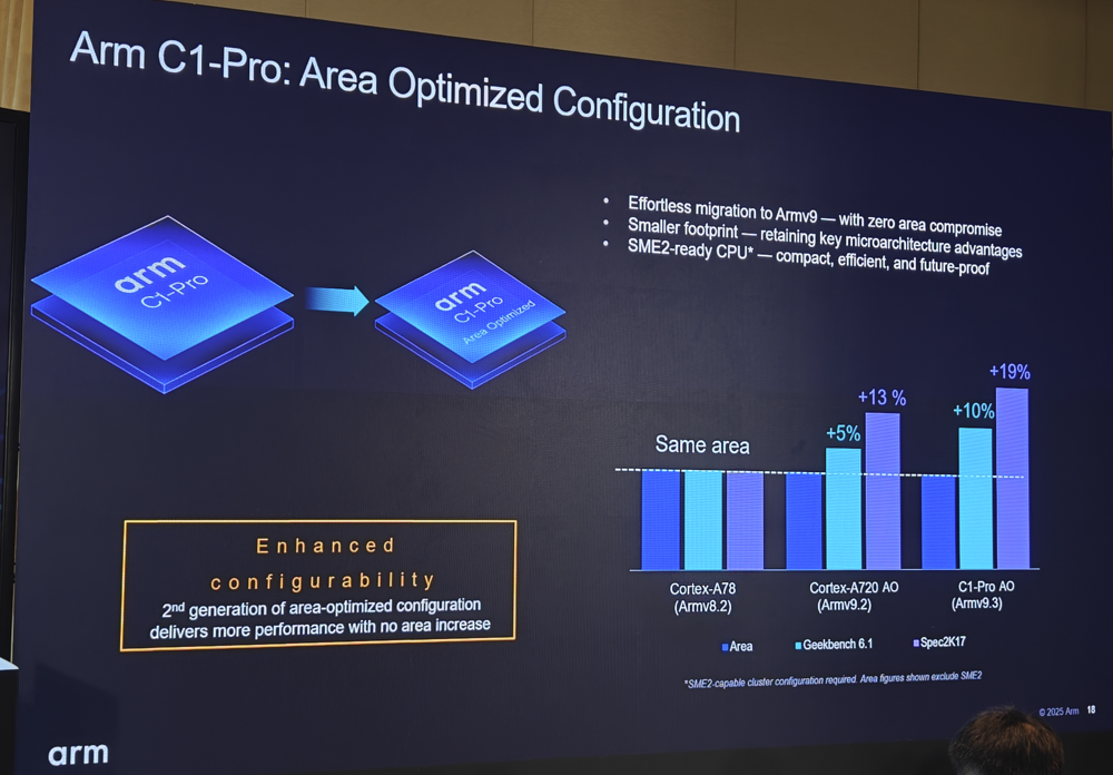 值得一提的是,C1-Pro 还具有面积优化的配置方案,可以帮助客户轻松地迁移到最新的Armv9.3,无需牺牲任何面积,并且保留关键的微架构优势,并支持SME2。
