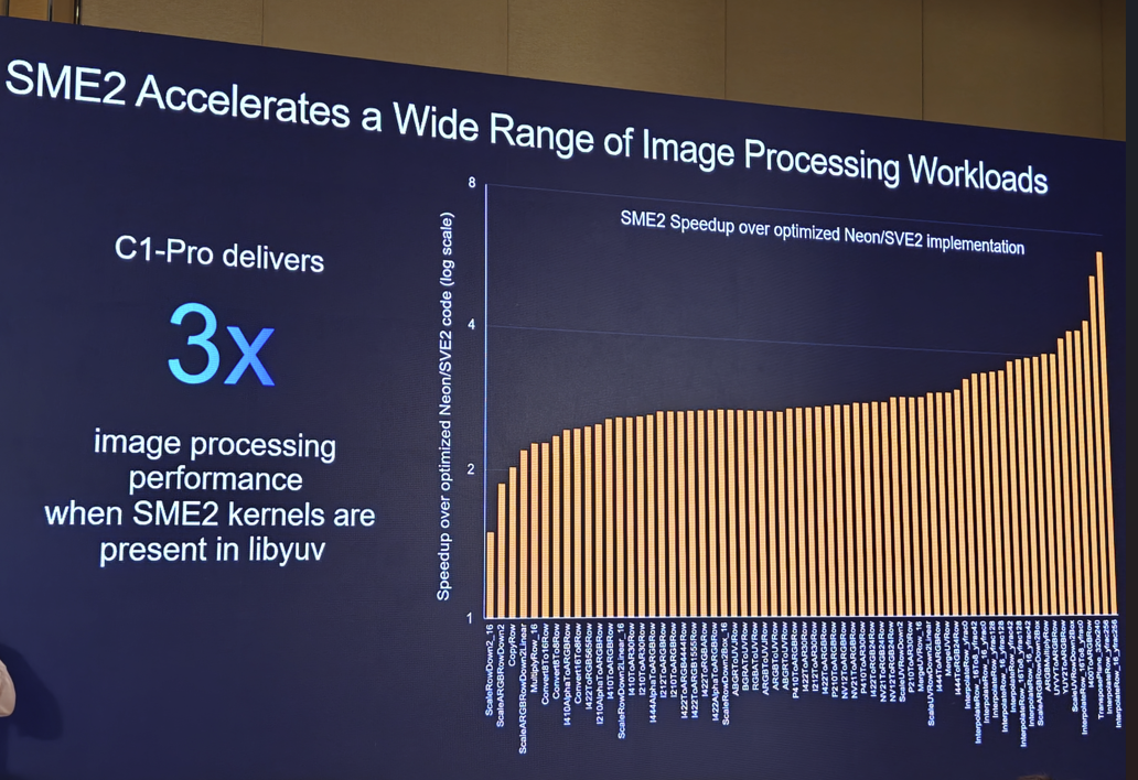 SME2 还可加速各种图像处理工作负载,比如在libyuv中,支持SME2的C1-Pro的图像处理表现提升到了原来的3倍。