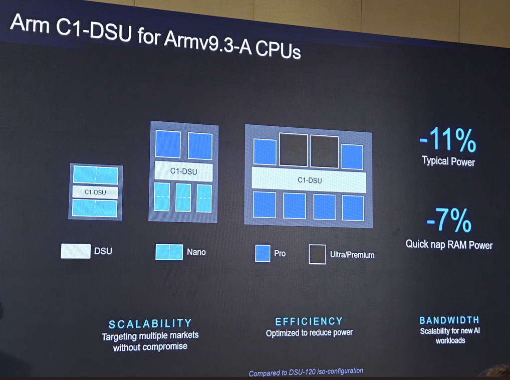 据Arm介绍,与DSU-120相比,C1-DSU典型功耗降低了11%,快速唤醒 RAM 功耗降低了7%。