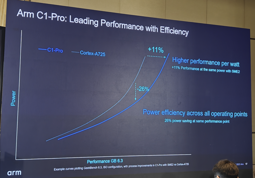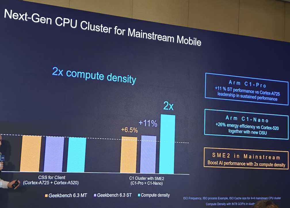 在Arm看来,下一代主流的智能手机的CPU集群可能将会是支持SME2的C1集群,比如C1-Pro + C1-Nano这样的组合,预计相比当前的Cortex-A725+Cortex-A520的组合,可以带来11%的性能提升和2倍的AI性能密度。