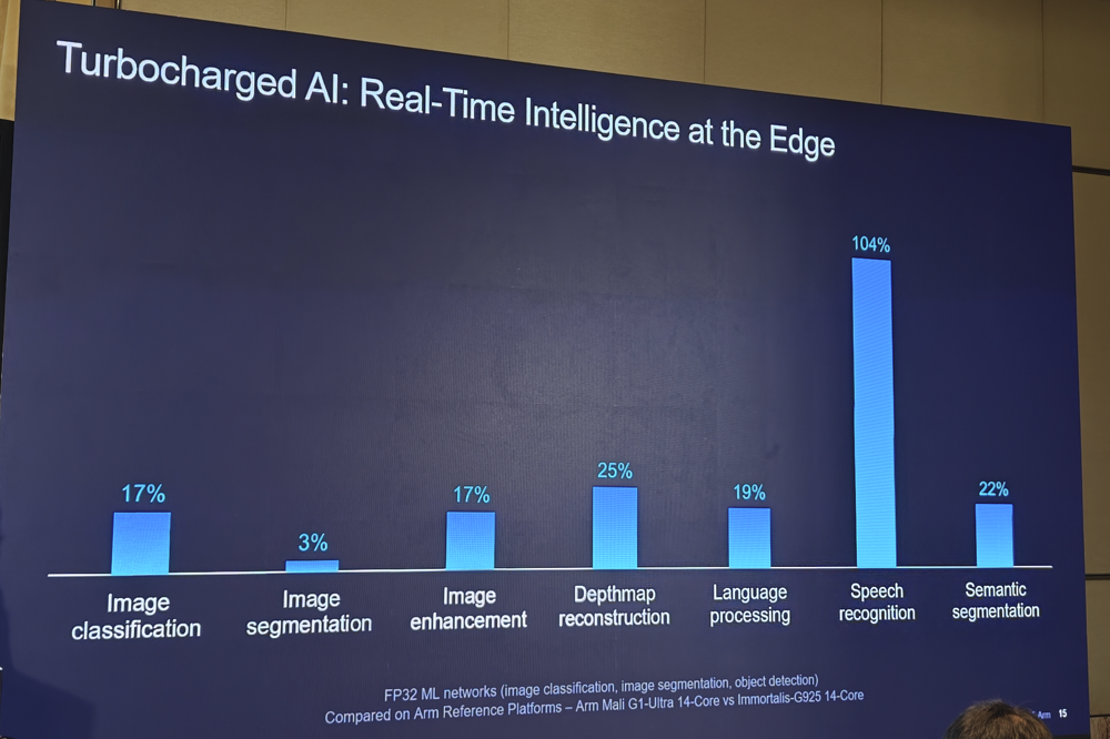 AI 正在重塑移动设备思考、感知与响应的方式,而 GPU 在这一演进历程中扮演着关键角色。Mali G1-Ultra 引入新的矩阵乘法单元 (MMUL) FP16 指令,可加速如语义分割、去噪、深度估计、物体检测、语音识别和图像增强等端侧关键 AI 工作负载。在FP32 ML网络中,Mali G1-Ultra与上一代 Immortalis-G925(同样均为14核心)相比,其性能提升高达 104%。