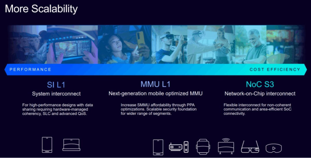 Lumex CSS平台要支持 AI 优先体验,自然不能只局限于CPU、GPU等计算 IP 和前面提到的多核调度的DSU IP的提升,还必须在整个互连和内存架构层面持续演进。所以,Arm为了Lumex CSS平台带来了全新的SI L1和MMU L1和NoC S3等系统IP,专为满足高要求 AI 和其他计算密集型工作负载的带宽与延迟需求而优化。