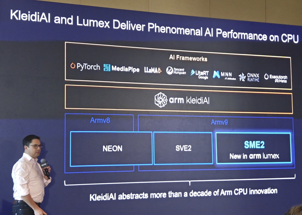 Arm KleidiAI 于 2024 年推出,旨在为Arm CPU 上运行的 AI 推理工作负载提供软件性能优化,开发者无需进行任何额外的工作,目前该软件库已应用于移动端、云和数据中心等关键领域,包括 KleidiAI 已被集成到 ExecuTorch、Llama.cpp、MediaPipe、PyTorch、LightRT等几乎所有主流AI框架的最新版本中,开发者只需开始构建应用程序,即可在基于 Arm 架构的平台上自动获取性能的显著提升。
