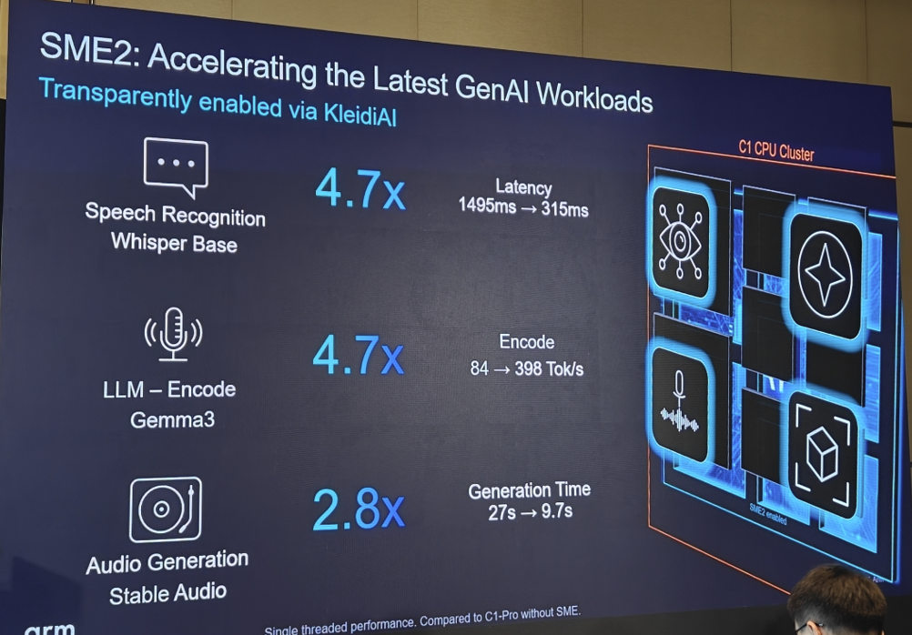 据Arm介绍,针对生成式 AI、语音识别、典型的机器学习 (ML) 和计算机视觉 (CV) 等工作负载,启用 SME2 的 Arm C1 CPU 集群在同等条件下,能比上一代 CPU 集群带来5倍 AI 性能提速。此外,借助 SME2,该C1 CPU 集群可实现多达3倍的能效优化。而上述的 AI 性能和能效改进能为用户带来更流畅、响应更迅速的端侧体验。