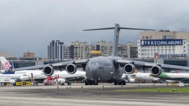 ▎6月6日降落台湾的美国军机机身上有明显的美国空军标志,图源:BBC/Getty Images